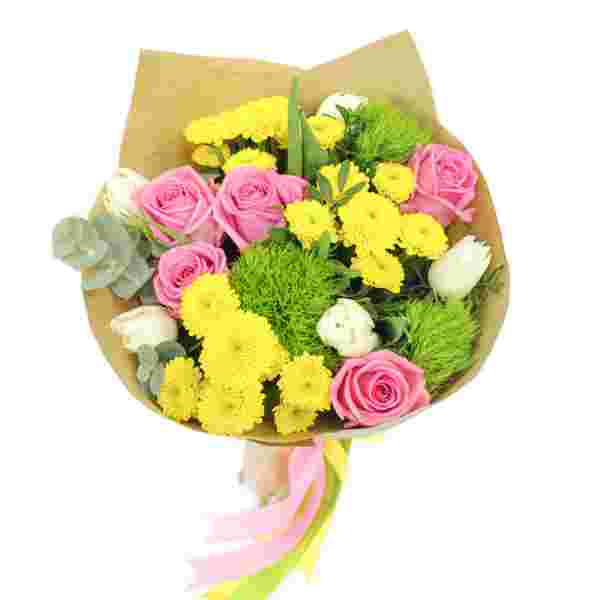 Состав: Роза 5, хризантема 3, грин тик 3, тюльпан 5, фисташка, эвкалипт, крафт, лента.