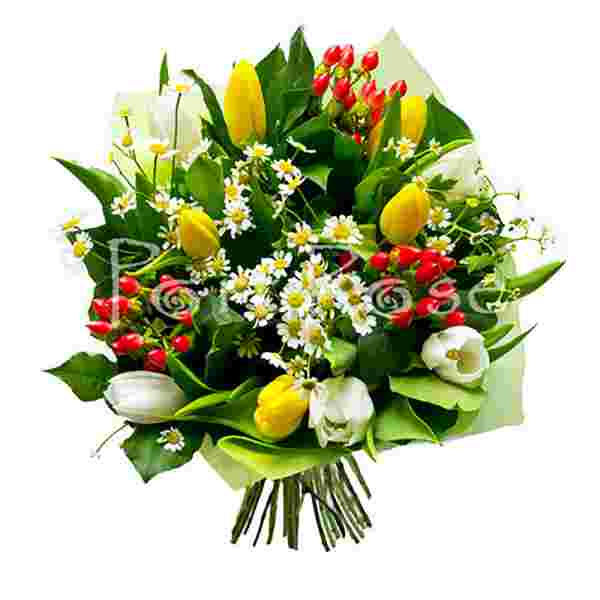 Состав: Тюльпан 11, танацетум камилла 3, гиперикум 3, зелень, фетр, лента.